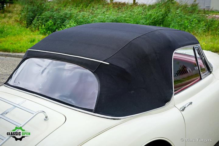 De zwarte mohair soft-top gaat eenvoudig open en dicht en er is een mooie afdekhoes bij voor als de soft-top omlaag is gevouwen.