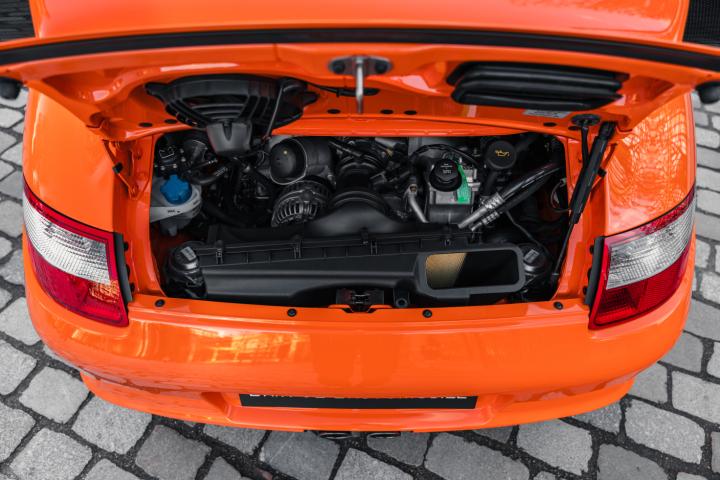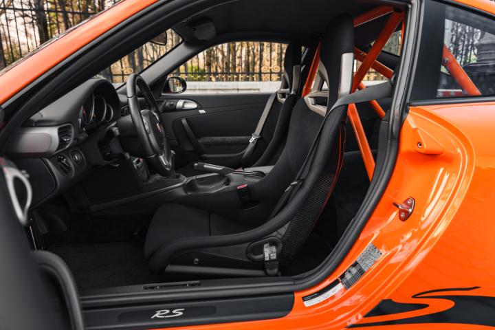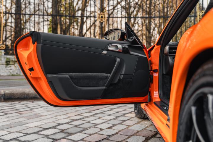 The exclusivity of the 997 GT3 RS is based on intensive weight reduction and specific distinctive elements. It adopts a wider chassis for better stability and also benefits from lightweight materials, including a carbon bonnet and spoiler, as well as a polycarbonate rear window. Its iconic Orange colour with black stripes or vice versa, as well as its lightweight forged alloy wheels, reinforce its aggressive look. Inside, the atmosphere is resolutely sporty with bucket seats, a partial roll cage and optional harnesses.