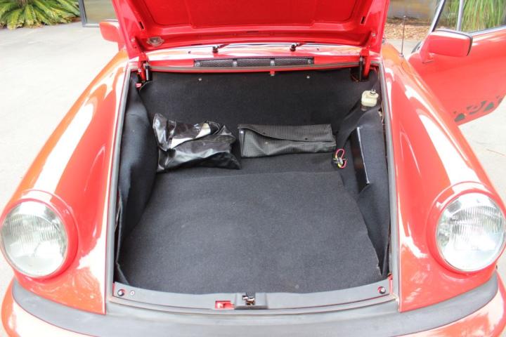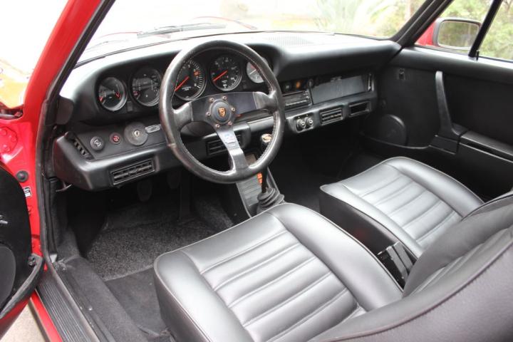 Maintaining its originality, this ’75 2.7 is finished in Guards Red, adorned with black ‘Carrera’ graphics, a prominent whale-tail rear spoiler, and classic Fuchs alloy wheels. Step inside to find a sleek black-trimmed interior, complemented by a sporty steering wheel and a Sony stereo/CD player.