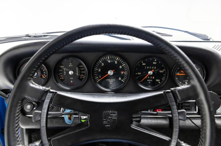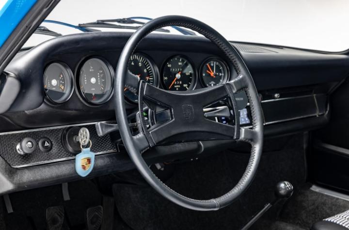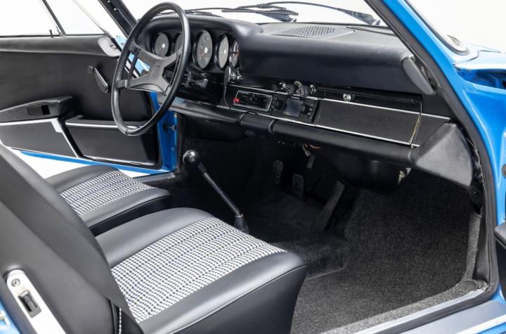 The Pastel Blue paintwork is in excellent condition, benefiting from a high-quality bare metal respray. The gaps and panel fit are excellent, with aluminum trim, brightwork, original glass, and H4 European headlights. Inside, the cabin features reupholstered front seats with black and blue houndstooth inserts, a black leather-wrapped VDM steering wheel with a deluxe butterfly horn ring, VDO gauges, Rennline magnetic phone charger that is synced to the Porsche Classic Communication Management (PCCM) Bluetooth stereo system for functionality and usability. The 911E rides on restored deep 6” x 15” Fuch alloy wheels mounted to Pirelli Cinturato CN36 tires. The undercarriage is solid and rust-free and is well-preserved, in the factory finish.